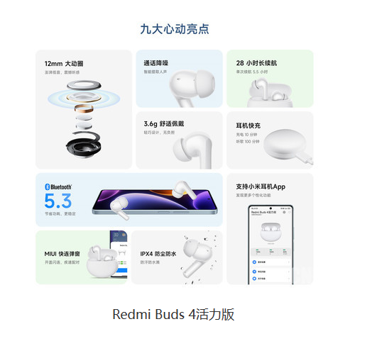 据小编了解,Redmi Buds 4活力版的配置经过精心调校,采用12nm大尺寸动圈,并由小米音频实验室倾力打造,以定制频响曲线呈现出丰富细腻的低音效果。该耳机内置高灵敏度麦克风,结合通话降噪算法,有效**环境噪音,使通话声音更加清晰,即使在喧嚣的环境中,对方也能轻松听到您的声音。