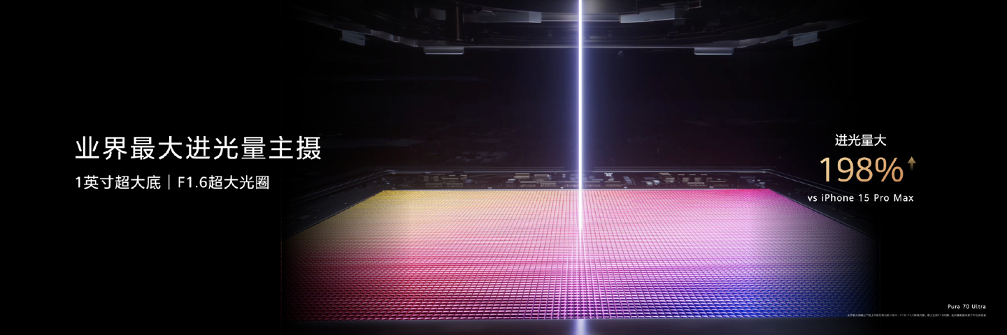 华为 Pura 70 系列主摄采用了 1/1.3 英寸大底传感器,配备业界**的 F1.4 物理光圈,带来超大进光量,长焦摄像头则为业界潮望式长焦**的 F2.1 光圈。华为 Pura 70 Ultra 更进一步,创新性地采用超聚光伸缩主摄以及 1 英寸大底传感器中**的 F1.6 物理光圈,让进光量再次实现突破。