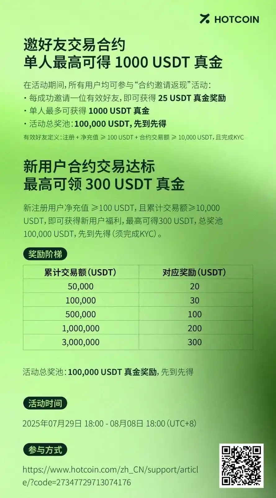 新注册用户净充值 ≥100 USDT,且累计交易额≥10,000 USDT,即可获得新用户福利,**可得 300 USDT,总奖池 100,000 USDT,先到先得(须完成 KYC)。