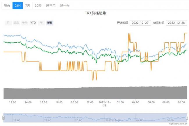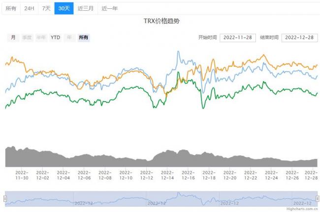 根据抹茶OKX消息,截止2022年12月28日,TRX波场币的市场行情价格数据详细内容为 当前市场行情价格:1 TRX波场币 = 0.05435美元 = 0.37829人民币(约等于) 24H**行情价格:0.05472美元 24H**行情价格:0.05373美元 24H行情价格涨幅:-0.67% 7D行情价格涨幅:-0.8% 总市值:50亿美元 币种市值排名:No.17二、TRX波场币**行情分析