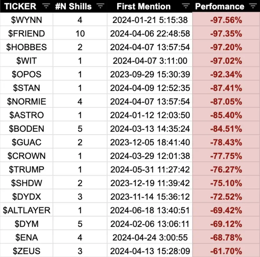 这不仅仅是吹嘘:这是关于信念。另一方面,Ansem 仅提到 1-2 次的**则**呈现 100% 的负回报。典型的拉升出货行为。