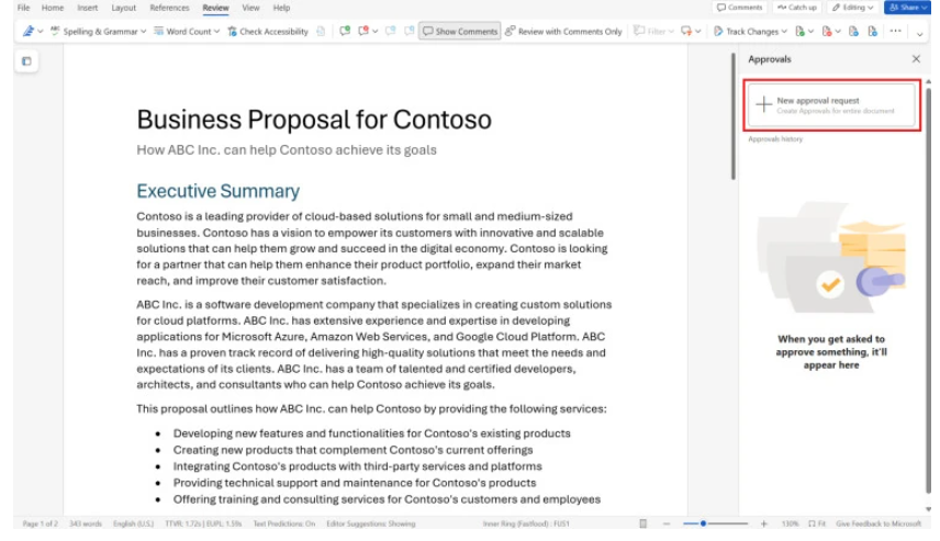 据小编了解,通过这款新的Word加载项,用户可以直接在正在编辑的Word文档中创建审批请求,这一改进进一步提升了工作流程的连贯性和效率。同时,用户还能通过该加载项,方便地查看和管理过去针对同一文档发起的所有审批记录。审批人员现在可以直接在Word文档内回应审批请求,而无需中断当前工作,转转到Teams应用中进行操作。