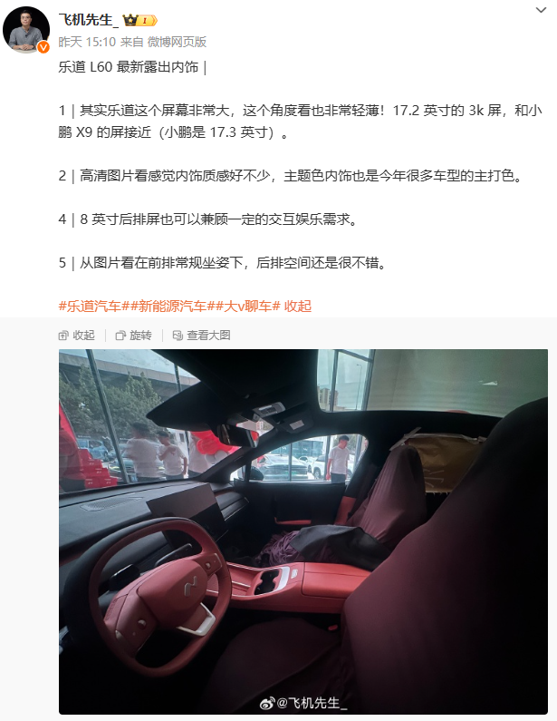 万元起,近日知名博主@飞机先生_ 曝光了其首款车型L60的内饰谍照,引起了广泛关注。