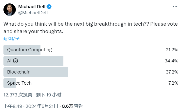 据戴尔的推文显示,撰稿当下,在他提供的量子计算机、人工智能、区块链和太空技术这四个选项中,区块链以37.2%的投票优势居冠,被网友评价为最为重要的技术突破,而AI则以34.4%的得票排名第二,第三和第四分别是量子计算机和太空技术,得票占比分别为21.2%和7.2%。