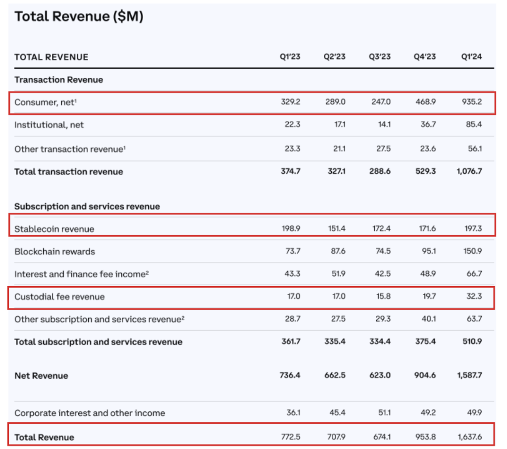 **季消费者交易收入为9.35亿美元,季增99%。**季消费者交易量为560亿美元,季增93%,消费者交易在**季出现了广泛的成长,包括新用户的成长、2023年之前获得的客户的交易活动的复苏以及每个用户的平均交易量的增加。此收入为Coinbase获利的主要来源。