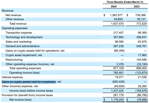 Coinbase在上次财报中就已预告,将由2024年起,将使用新的会计准则。并于本季认列了「为投资而持有的加密资产收益」6.5亿美元。本季净利达11.76亿美元,而上年同期为亏损7,890万美元。