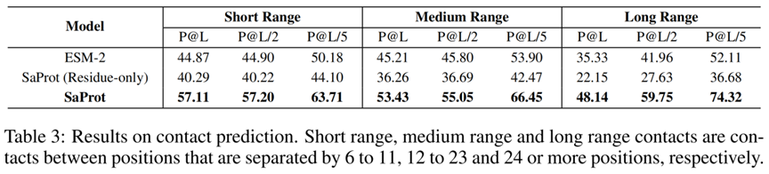 论文对SaProt和ESM-2在残基接触预测任务(Contact Prediction Task)上进行了测试。作者冻住了模型的backbone,只训练一个线性分类层。实验结果如下: