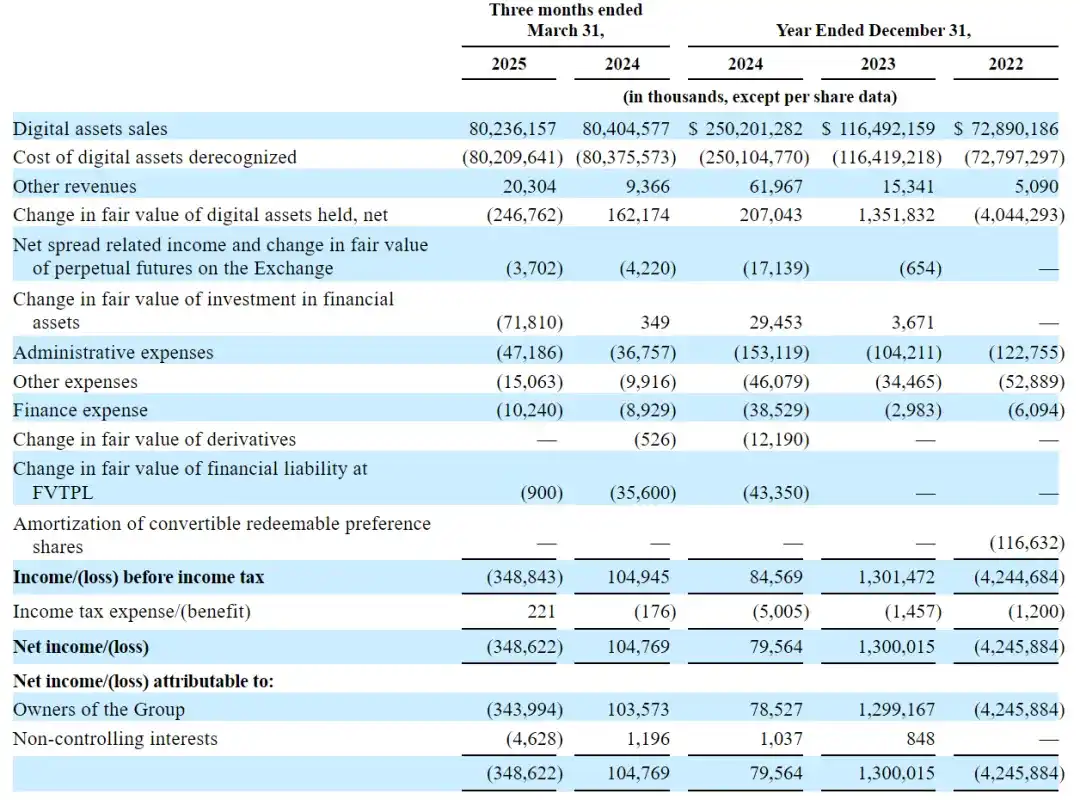 Bullish 在 2025 年**季度数字资产销售(Digital assets sales)为 802.36 亿美元,上年同期为 804 亿美元;净亏损为 3.48 亿美元,上年同期的净利为 1.05 亿美元。