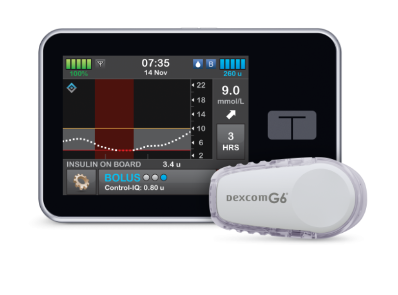 ▲ Tandem 胰岛素泵 混合闭环系统需要将传感器植入皮下,该传感器定期持续监测血糖水平。传感器会将数据无线发送到佩戴在外部的泵,该泵将根据血糖信息提供适当的胰岛素剂量。其名称的“混合”部分是指:在自我调节系统中仍然需要一些用户输入,包括输入碳水化合物摄入量。
