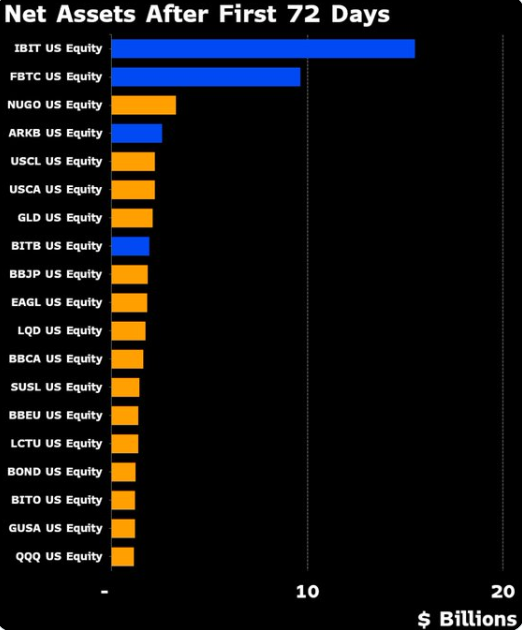 不过Balchunas表示,IBIT仍有机会创下其他记录,他分享了上市前72天的ETF资产总额,贝莱德的IBIT位居榜首,富达的FBTC位居第二,其他比特币现货ETF包括方舟的ARKB和Bitwise的BITB也都在榜上,可见这一切有多么火热。
