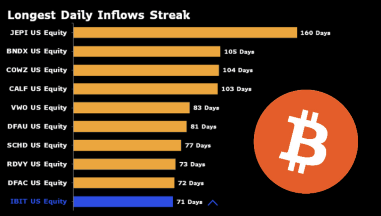 根据彭博社ETF分析师Eric Balchunas的ETF连续净流入天数记录,贝莱德比特币现货ETF IBIT在昨日未出现资金流入,故其每日连续流入的记录已终止在71天。**名是摩根大通股票溢价收入ETF(代码JEPI),于2020年发行,竟然有惊人的160天连续净流入。