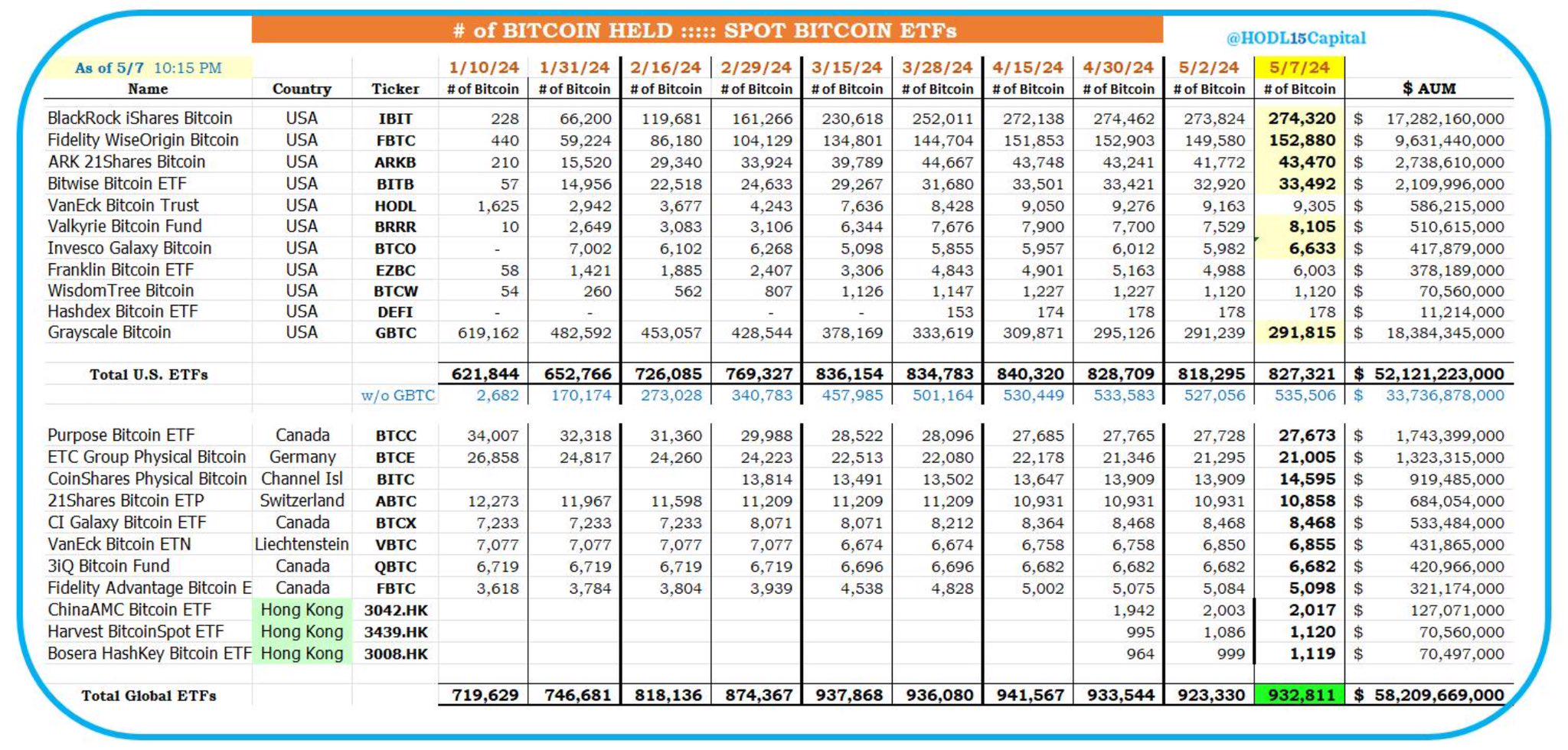 放眼全球比特币现货ETF的市场规模,美国无疑是主力军。据HODL15Capital数据监测,截至5月7日,美国比特币现货ETF在推出4个月时间已持有827321万枚BTC,价值约为521亿美元,占全球市场的89.5%。