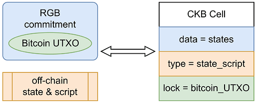 RGB 通过集成Nervos CKB区块链上的智能合约来增强比特币的功能。RGB 的突出特点是其同构绑定,它同步比特币和CKB Nervos区块链之间的资产管理。从实际角度来看,每个比特币UTXO都与CKB区块链上的相应Cell(想象为“交易块”)链接。因此,当使用UTXO进行比特币交易时,它会自动记录在CKB区块链上,CKB上的相应Cell将被更新。