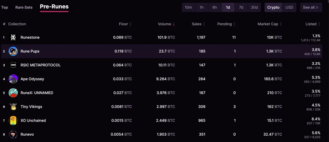 在比特币生态又一次大规模公平发射的机会下,虽然**符文尚未诞生,但市场早已蠢蠢欲动。 Runestone 等预符文项目提前起飞, Magic Eden 数据显示,4月 18 日, Runestone 地板价已来到0.089枚 BTC , Pune Pups 地板价则已高达0.119 枚 BTC 。
