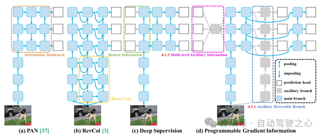 如下图所示,(a) 路径聚合网络(PAN),(b) 可逆列(RevCol),(c) 传统的深度监督,以及 (d) YOLOv9提出的可编程梯度信息(PGI)。