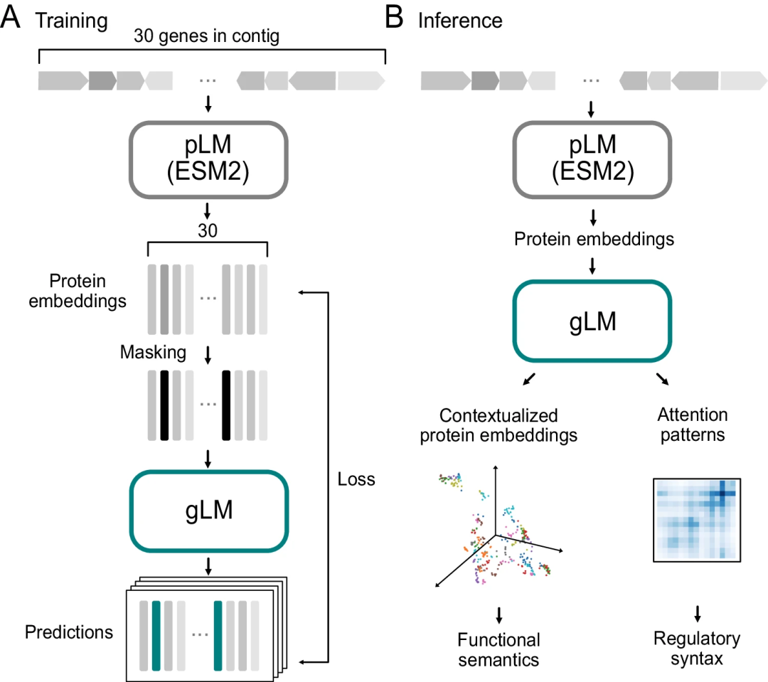 为了缩小基因组背景和基因序列结构功能之间的差距,哈佛大学和 MIT 的研究人员开发了一种基因组语言模型(gLM)来学习基因的背景表示。gLM 利用 pLM 嵌入作为输入,对基因产物的关系属性和结构信息进行编码。