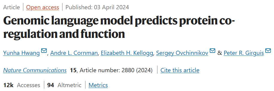 该研究以「Genomic language model predicts protein co-regulation and function」为题,于 2024 年 4 月 3 日发布在《Nature Communications》。