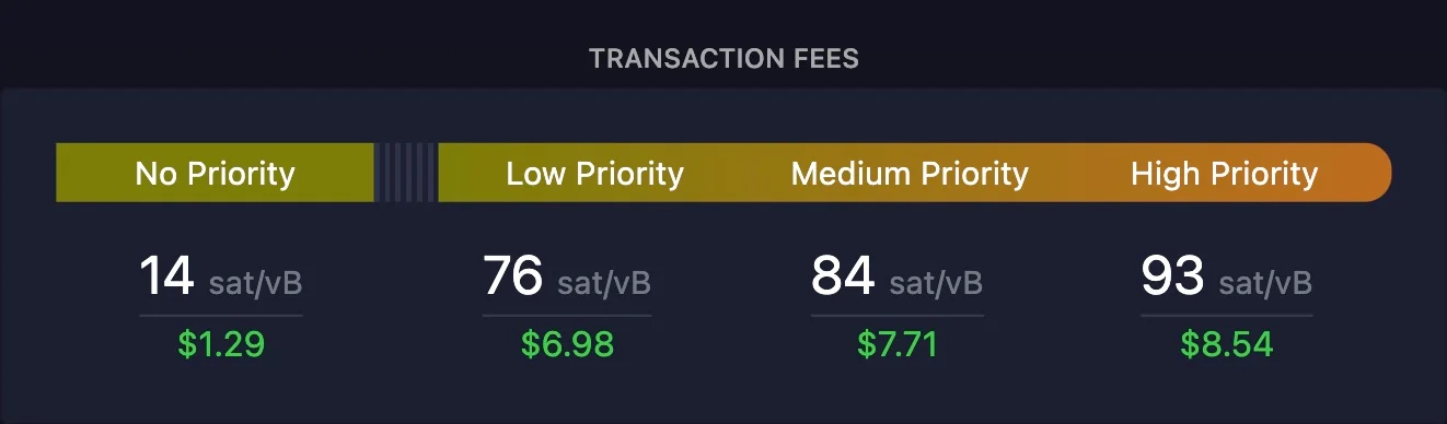 另一方面,周末由于用户争相铸造符文**,令比特币交易费用大增的状况(高优先级费用一度突破2,000Sat,逼近200美元),目前也有所缓和。