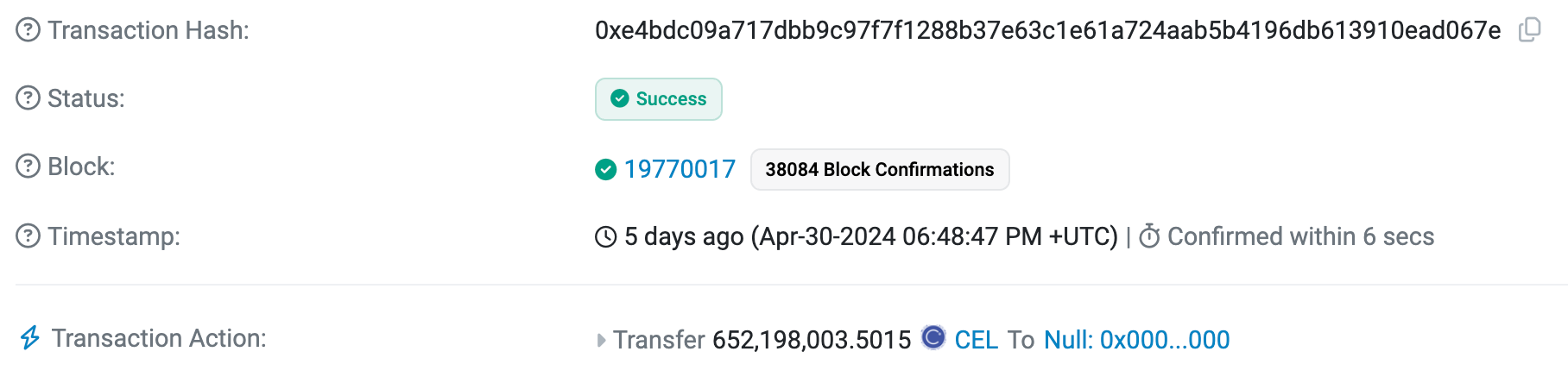 4月30日,Celsius Network开始**销毁操作,销毁了其持有的$CEL**,根据Etherscan的信息,Celsius通过将6.522亿个$CEL**发送至一个空地址,来完成这次的**销毁。这次销毁的量占到了先前总供应量的94%,总量为6.928亿个$CEL,按当前市场价格计算,这些**的价值约为4.15亿美元。