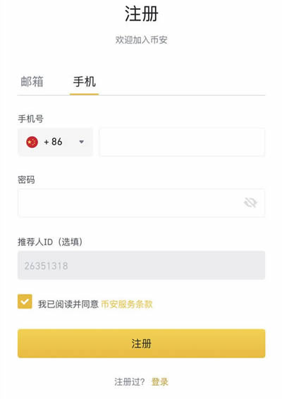 1、注册一个支持购买UNI的交易所,本文以币安网Binance(https://accounts.binancezh.io/)为例,注册币安网时输入手机号和密码即可成功注册。