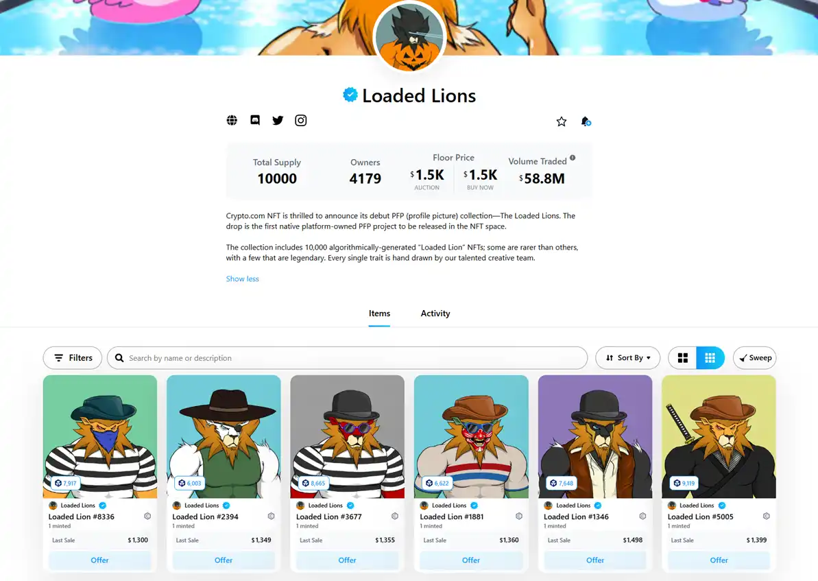 Loaded Lions 是 Crypto.com 在 2021 年官方推出的 NFT 系列,目前地板价为 1500 美元。
