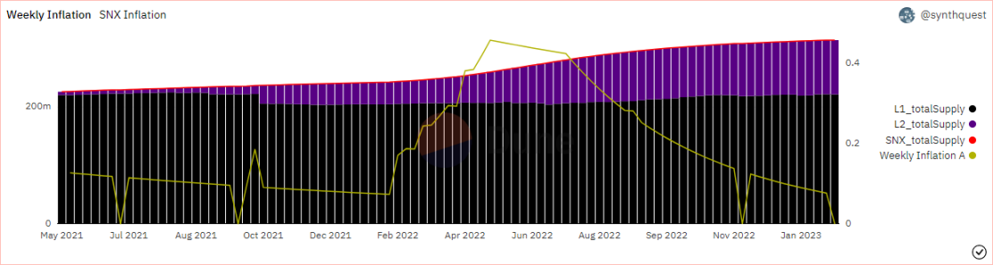 据Dune 数据显示,撰写本文时,SNX 总量为约 3.14 亿,L1 与 L2 总计的质押率约为 67.37%,而在 Curve 上提供流动性并可以进行原子交换的 sUSD、sETH、sBTC(包括 L1 和 L2)分别约有 3690 万枚、19180 枚、576.7 枚,按照撰写本文时的 SNX 以及比特币、以太坊价格计算,这些提供流动性的 s**ate.ion 总价值约为 8340.48 万美元,质押的 SNX 总价值约为 5.589 亿美元,可用于原子交换的 s**ate.ion 总价值不到质押 SNX 总价值的 15%。