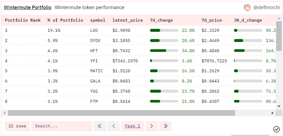 一个有趣的发现是,Wintermute持有大量HFT,占比达到4.6%,在其持有**中位列第三。需要说明的,Wintermute将持有HFT**分拆到了两个钱包中,因此下图中的占比数量可能不太准确,粗略估计Wintermute的HFT**持有占比应该在10%左右,而过去30天HFT的涨幅达到了惊人的154.3%。此外Wintermute投资组合中的DYDX最近表现也相当不错。