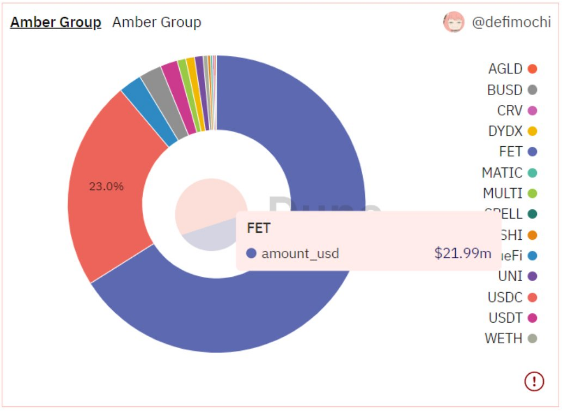 现阶段,链上数据只能追踪Amber Group大约3000万美元的投资组合信息,结果显示该机构最近添加了FET**,而且数量巨大,目前占到其整体投资组合的近60%(价值约2199万美元)。此外,Amber Group当前依然持有价值约700万美元的稳定币USDC。