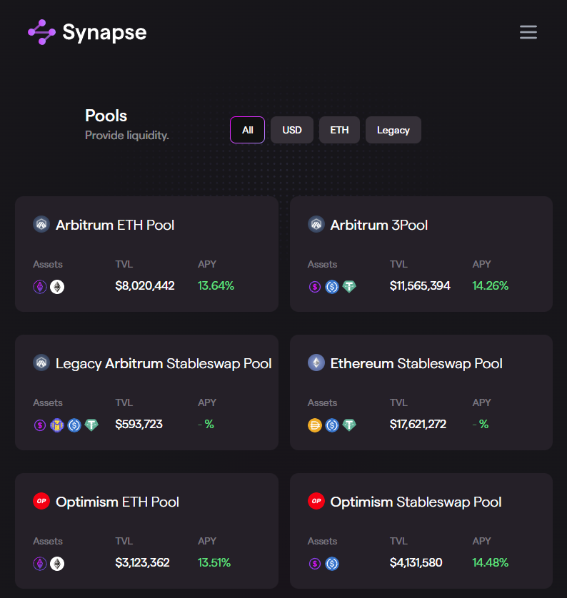 对于已建立的稳定币和 ETH,Synapse 使用 "Nexus",它在所有支持的链上都有流动资金池来桥接资产,用户可以在这些链上做 LP 以获得 $SYN 奖励。