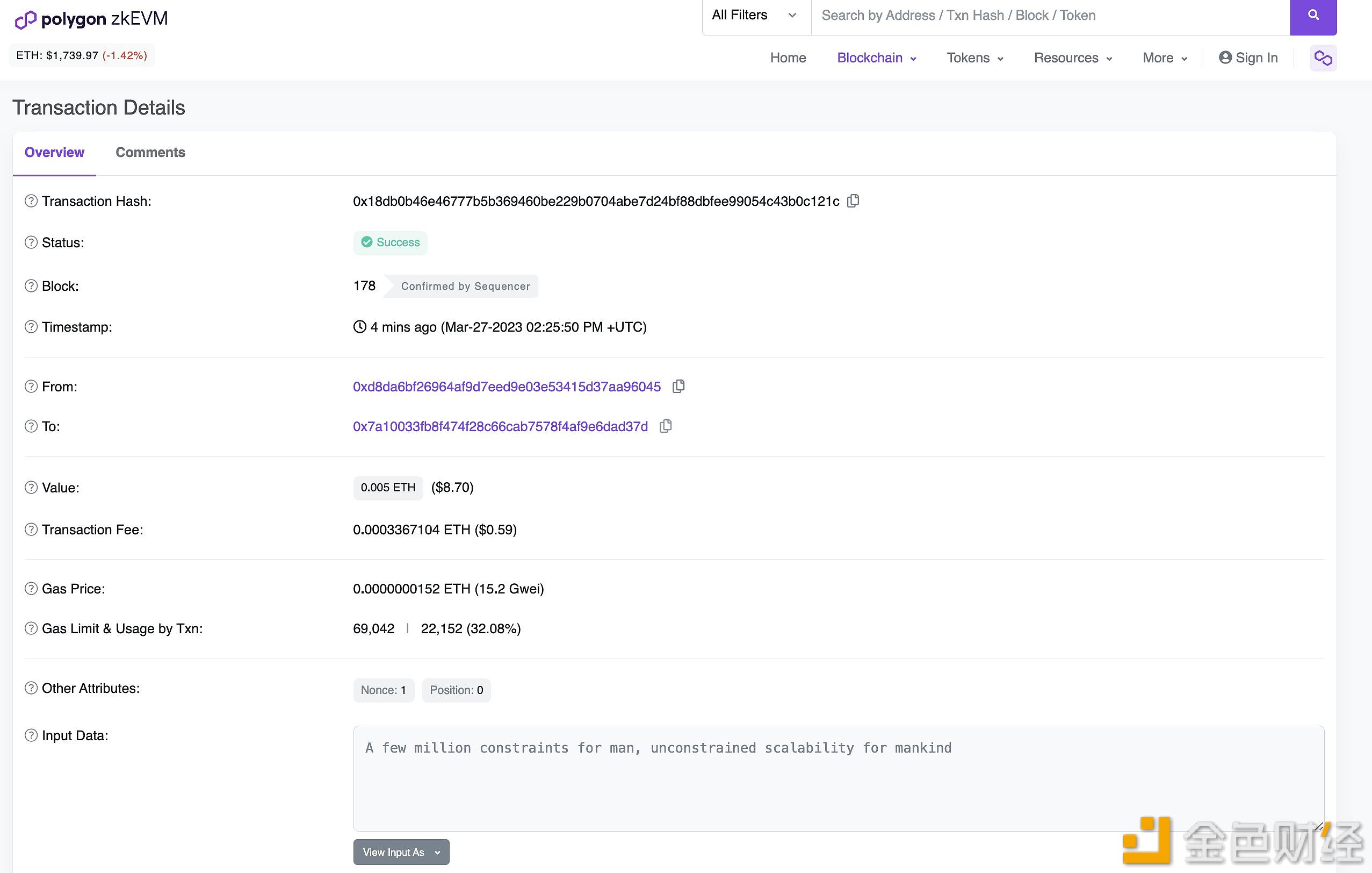 据Polygon Labs开发工程师steph.polygon在社交媒体透露,以太坊联合创始人Vitalik Buterin已在Polygon zkEVM主网上完成了其**笔交易,交易哈希:0x18db0b46e46777b5b369460be229b0704abe7d24bf88dbfee99054c43b0c121c,交易额为0.005 ETH,交易费0.0003367104 ETH,gas费用0.0000000152 ETH。