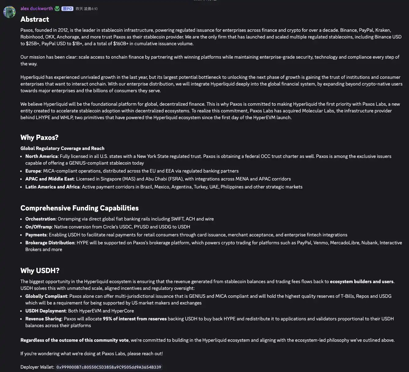老牌合规稳定币机构 Paxos(曾发行 USDP 和 PayPal USD)率先提交提案。Paxos 承诺将 USDH 打造为「Hyperliquid **」的合规美元稳定币,**符合美国《稳定币创新法案(GENIUS)》和欧盟 MiCA 法规标准。技术上,USDH 将由 Paxos Labs 部门运营,在 Hyperliquid 的两条链(HyperEVM 和 HyperCore)上原**行。