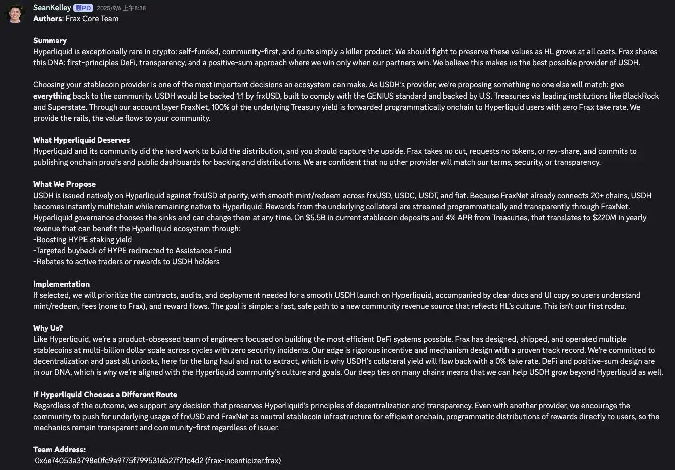 去**化美元稳定币协议 Frax Finance 也火速跟进提交了方案。Frax 的提案主打「极致让利」和链上治理,承诺将 USDH 的底层收益 100% 返还给 Hyperliquid 社区。