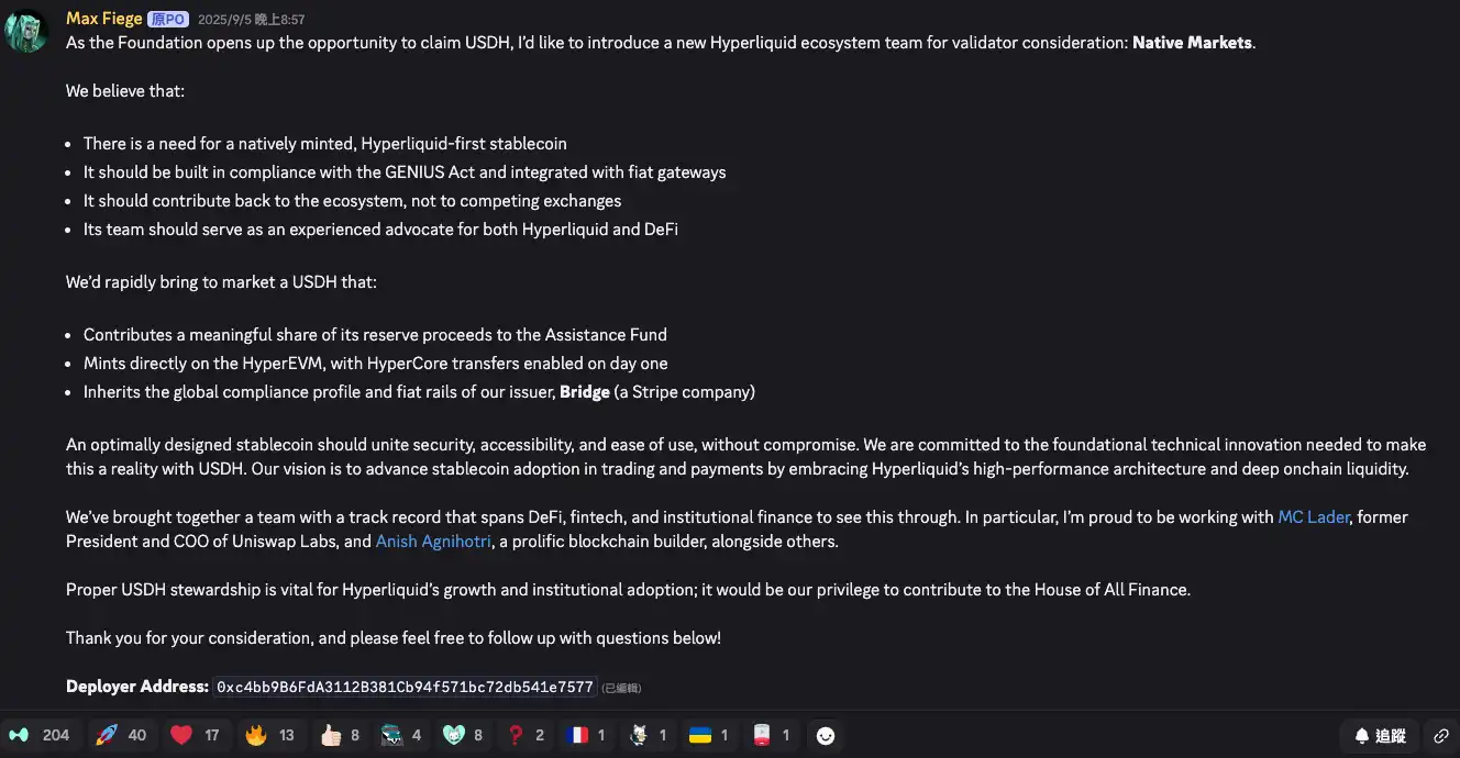 Native Markets 的提案是由此前牵头促成 Hyperliuquid DAT 上市公司 Hyperion 的社区** Max 提出的,同时他也是所有提案中引发最多社区成员讨论的。