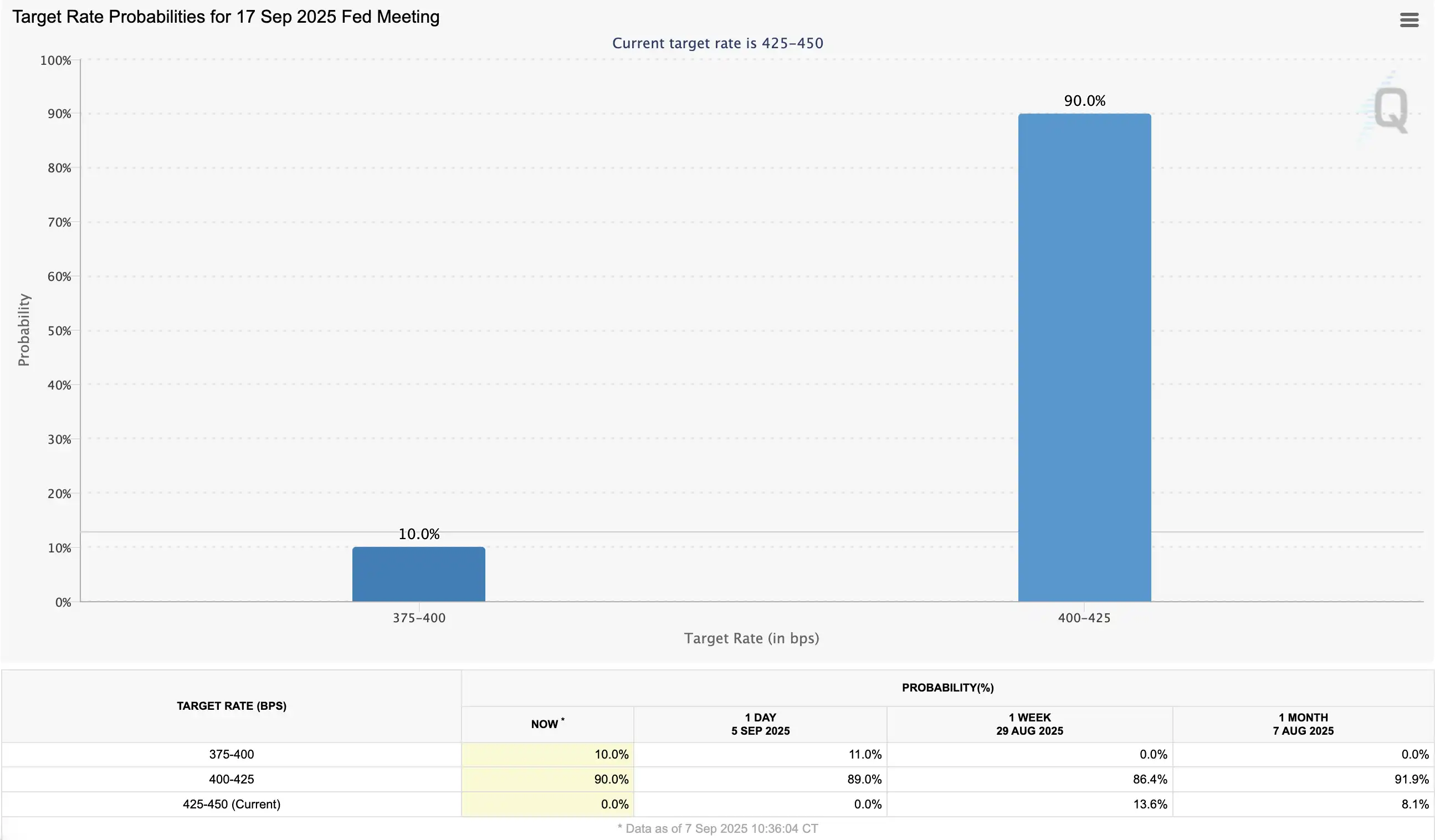 9 月 5 日,美国劳工部公布的 8 月非农就业数据再次令市场失望——新增就业仅 2.2 万人,远低于预估的 7.5 万人。至此,非农已连续四个月**,8 月也将过去四个月的平均新增就业数拉低至仅 2.7 万。疲弱数据直接推动市场对美联储政策路径的重新定价:9 月、10 月和 12 月连续降息的预期**升温,据 CME 数据显示,美联储降息概率从公布前的 86.4% 飙升至 100%,其中 90% 押注 25 个基点,10% 甚至押注 50 个基点。