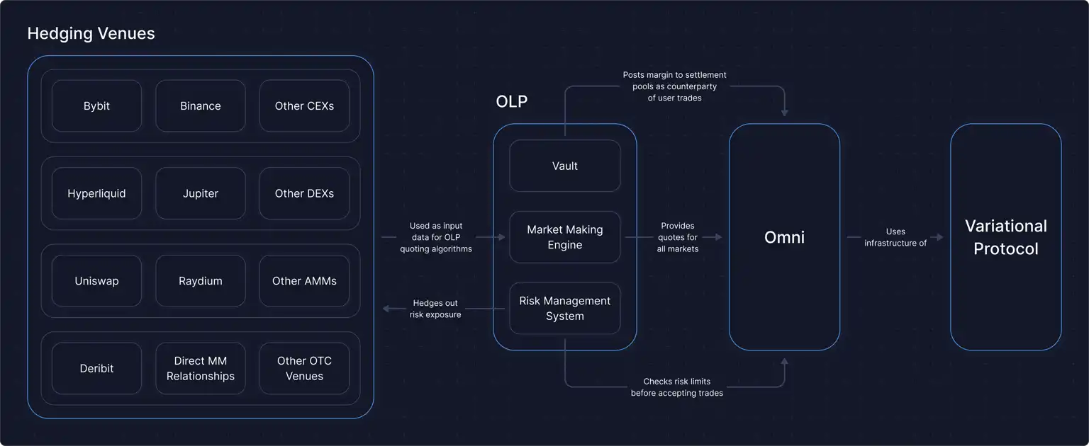 当你在 Omni 上开仓时,OLP 会立马跑到 Binance、Bybit 这些 CEX 或者 Hyperliquid 这样的链上 DEX 反向交易来对冲风险。