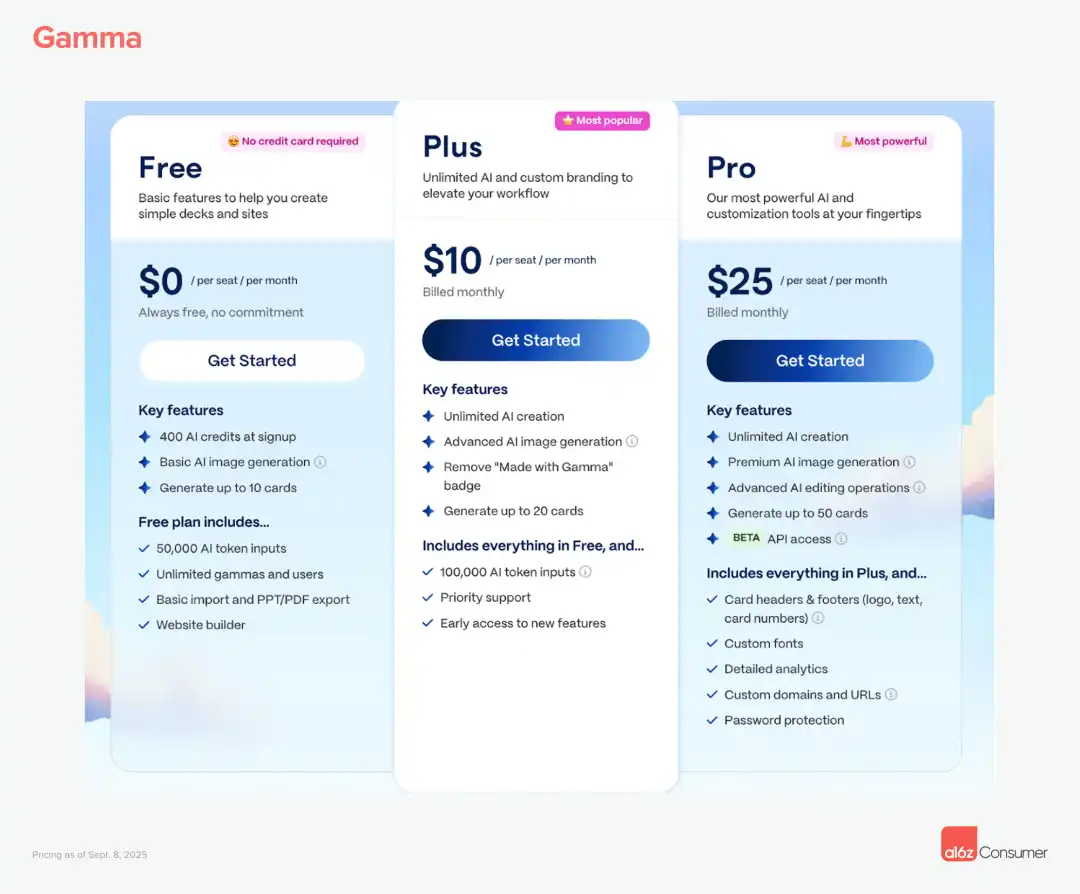 让我看看一些具体例子。Gamma 的 Plus 计划每月 8 美元,用于去除水印——这是大多数企业使用的要求——以及其他功能。然后用户为添加到其工作空间的每个协作者付费。这种模式聪明地利用了企业对专业外观的需求。