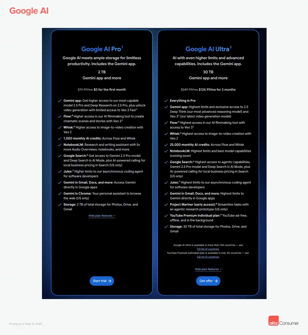 让我看看一些具体的例子。Google AI 提供每月 20 美元的 Pro 订阅和每月 249 美元的 Ultra 订阅,当用户(不可避免地)超过其包含的数量时,还会对 Veo3 积分收取额外费用。额外积分包从 25 美元开始,一直扩展到 200 美元。据我了解,很多用户在额外 Veo 积分上的花费可能与基础订阅一样多。这就是一个**的例子,说明了如何让收入随着用户参与度的增长而增长。