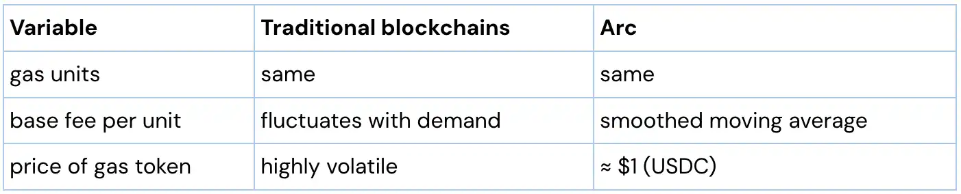 Arc 最显著和重要的创新之一是 USDC 是网络的原生 Gas **。每笔交易费用都以 USDC 支付,这是一种与美元挂钩的稳定币,而不是投机性资产。由于 USDC 被设计为保持稳定价值,企业不必担心他们的区块链运营成本会随着加密市场波动而上升和下降。