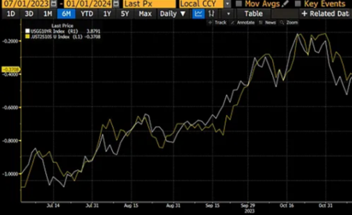 这份报告中,确认了美国财政部将借款更多地转移到收益率曲线的短端。随着国库券供应量的增加和收益率的提高,货币市场基金(MMF)将受到经济激励,使用 RRP 中存放的现金购买国库券。在其他条件相同的情况下,RRP 余额的下降增加了系统的流动性;这就是全球债券和股票市场大幅上涨的原因。白线是10年期国债,黄线是10年期和2年期国债收益率之间的差异。如你所见,收益率在10月底达到**,呈熊式加剧趋势,意味着白线和黄线同时上升。11月初开始了一场猛烈的债券空头挤压,收益率暴跌。