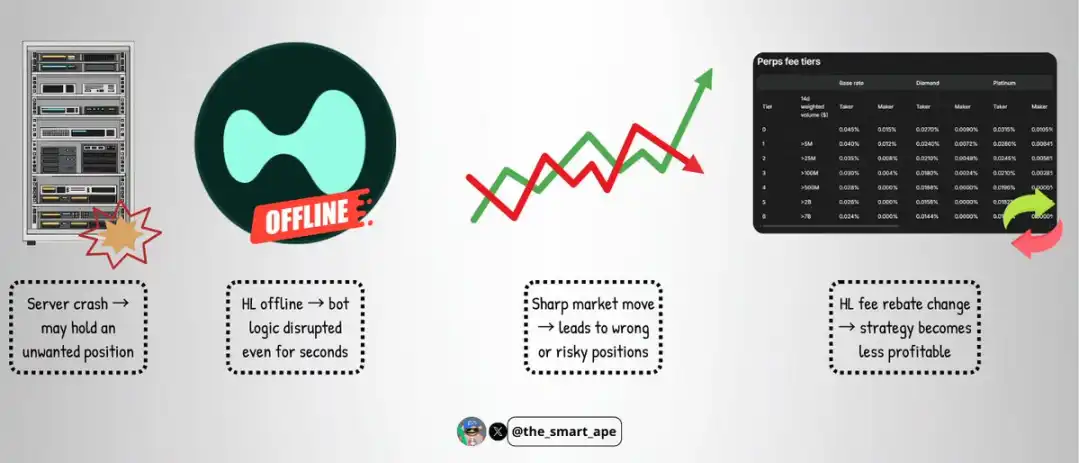 2.交易所故障:虽然罕见,但 Hyperliquid 平台若出现宕机或故障,可能在几秒内打乱机器人的交易逻辑;