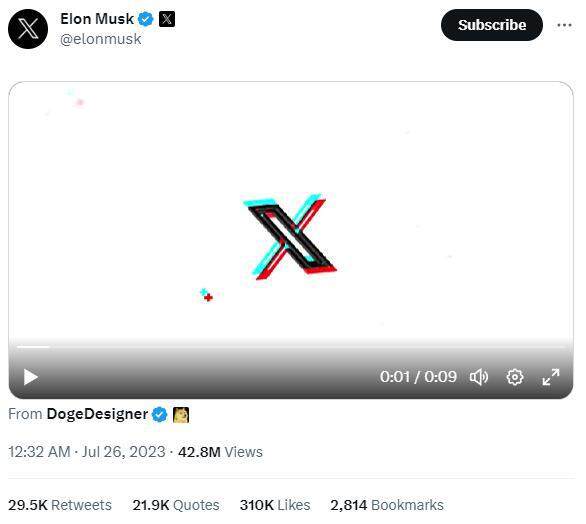 推特老板马斯克(Elon Musk)将推特正式更名为X后,周三(7月26日)凌晨转发消息,向社群展示X商标的新形态视频。眼尖网友发现,该视频源自于狗狗币的图形设计师DogeDesigner。消息传出后,狗狗币一度跳涨超过10%,周三亚市微幅回调报在0.08052美元。