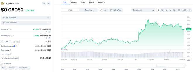 据CoinMarketCap交易图表,狗狗币在发出马斯克转推的瞬间,迅速从0.077美元涨至**0.083美元,升幅超过10%,周三亚市仍维持在0.08上方交易。