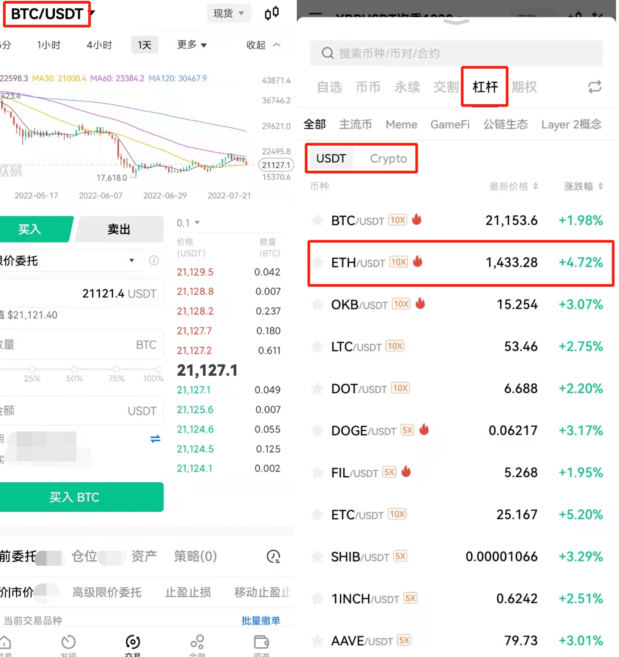 进入ETH/USDT杠杆交易页面,选择买入,选择全仓/逐仓模式,选择委托类型、保证金类型(USDT保证金)、杠杆倍数、交易价格,交易数量/金额,点击「买入ETH」按钮即可下单成功。挂单成交后,即可在仓位界面查看持仓相关数据,仓位可通过止盈止损、平仓、市价全平三种方式平仓。