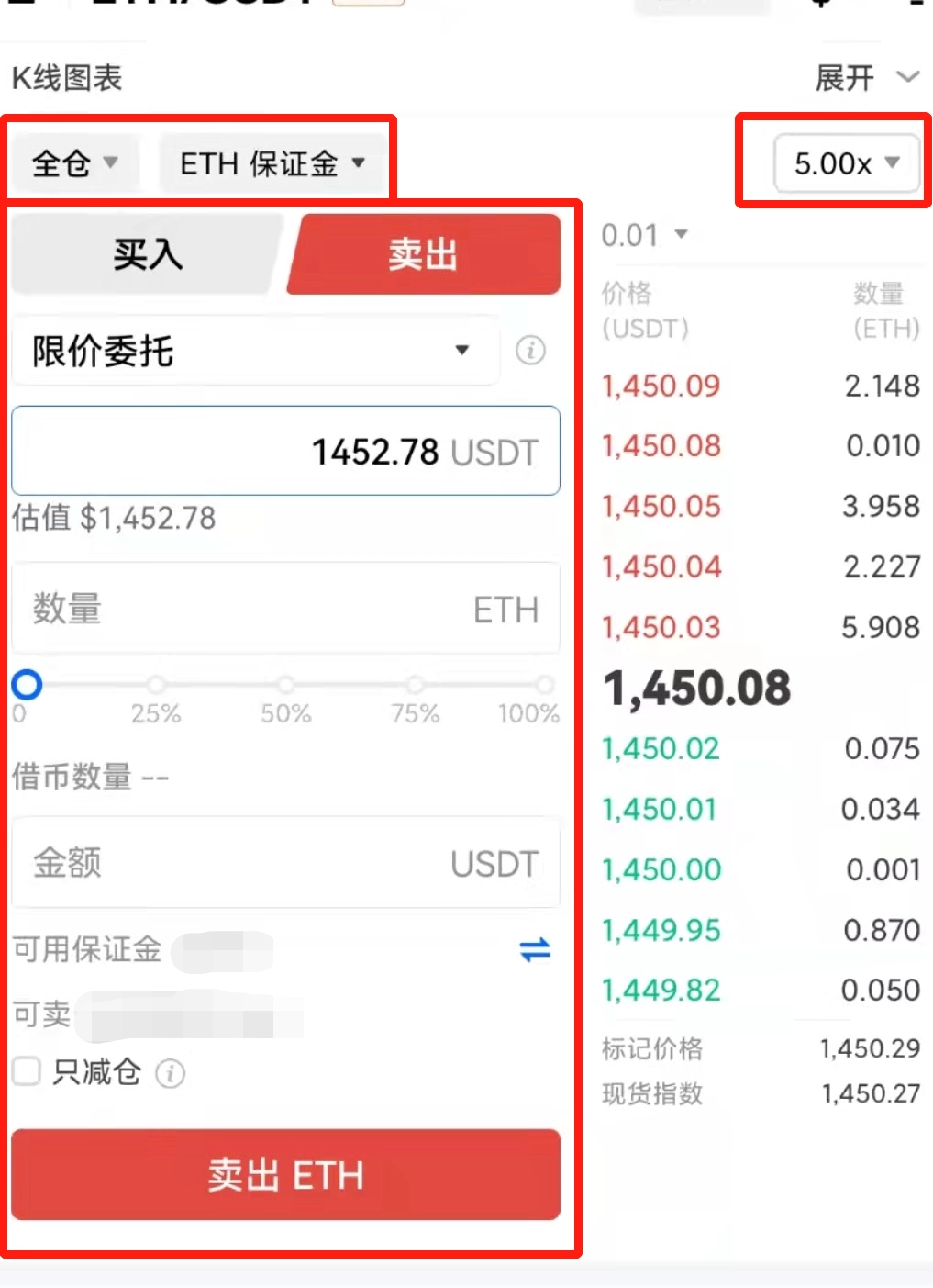 进入ETH/USDT杠杆交易页面,(benmuji.cn)选择卖出,选择全仓/逐仓模式,选择委托类型、保证金类型(ETH保证金)、交易价格,交易数量/金额,点击「卖出ETH」按钮即可下单成功。挂单成交后,同样可以在仓位界面查看持仓相关数据。