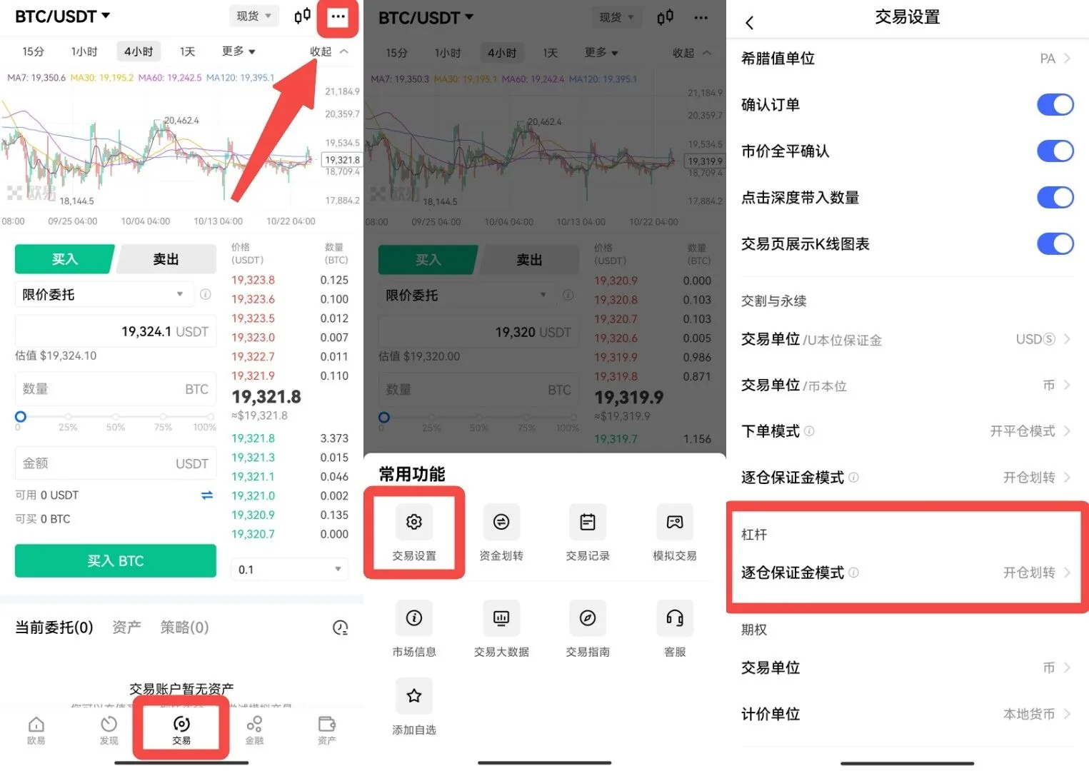 老用户在「交易设置」界面,点击[ 账户模式 ],请仔细阅读统一账户四种模式的信息,开通并设置为单币种保证金等模式。在该页面,也可进行杠杆交易的模式设置。