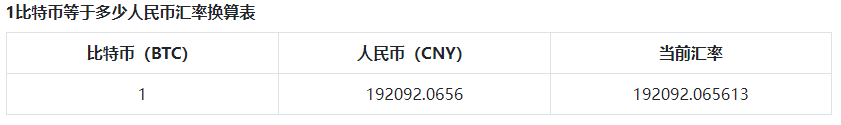 比特币兑换人民币的**汇率为:192092.065613(1比特币 = 192092.065613人民币)