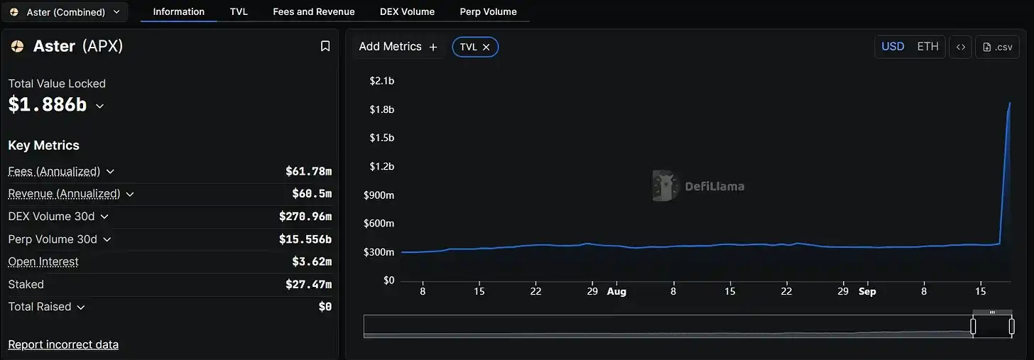 该图表展示的是去**化永续交易平台 ASTER 的原生**,该交易平台于前一日刚刚上线。