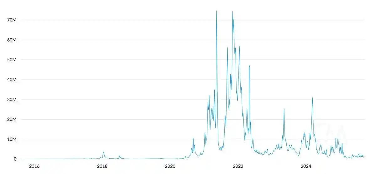 Tom Lee 的论点认为:稳定币和资产**化活动增加会推高交易量,从而提升 ETH 的手续费收入。表面看似合理,但只要花几分钟查阅数据就会发现事实并非如此。