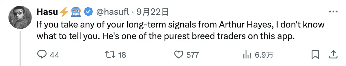 Flashbots 战略主管 Hasu 就曾点评 Arthur Hayes 表示:「如果你从 Arthur Hayes 那里获取了**长期信号,我真不知道该对你说些什么。他是这个市场上最纯粹的交易员之一。」