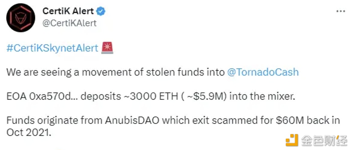 据CertiK监测,EOA地址(0xa570d...)将约3000枚ETH(约590万美元)转入Tornado Cash。该笔资金来自2021年10月的AnubisDAO 6000万退出**事件。